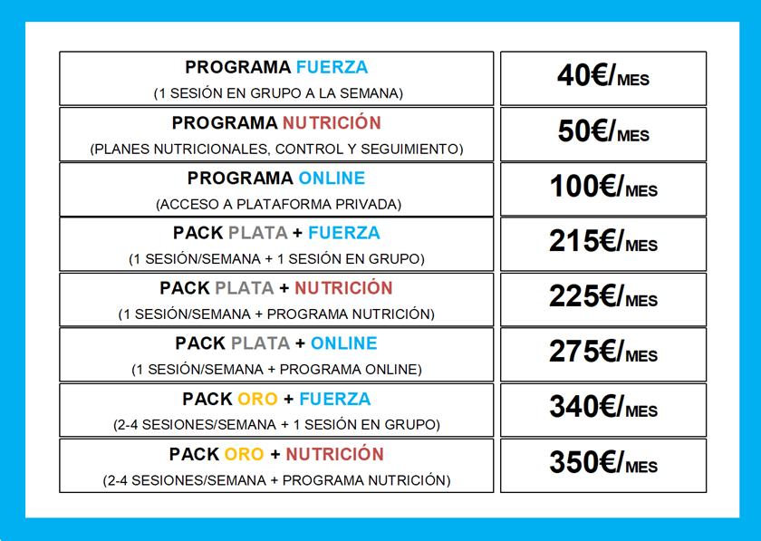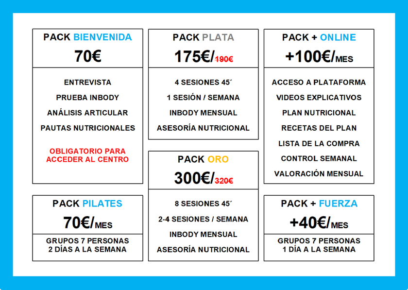 El Pack Bienvenida o valoración inicial es la sesión donde analizaremos tu estado físico actual, historial de lesiones, objetivos y plan de entrenamiento más adecuado. Tiene un precio de 70€ y es obligatorio para acceder a cualquier programa. Los Packs Plata y Oro son bonos de 4 y 8 sesiones respectivamente, a los que puedes añadir tanto la opción + Fuerza, la opción + Nutrición o la opción + Online.